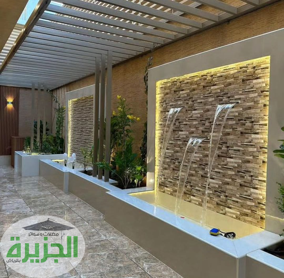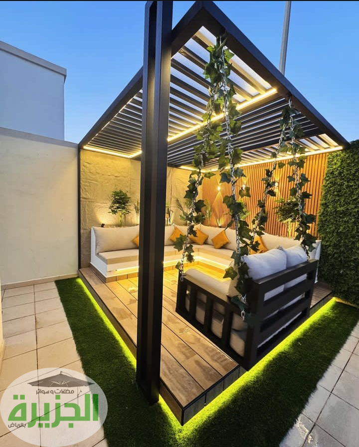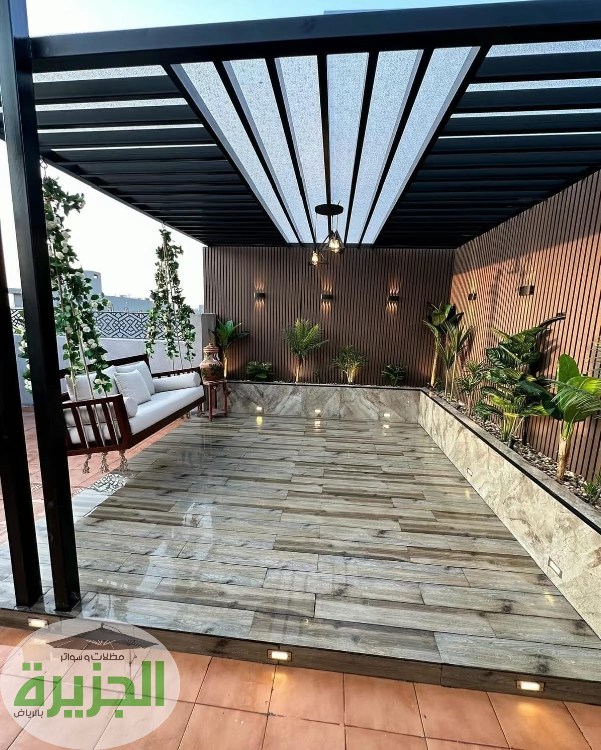 • المظلات الخشبية (البرجولات): تعطي لمسة كلاسيكية فخمة، ويُفضل استخدام الخشب المعالج أو “الليوود” لمقاومة النمل الأبيض والتآكل.