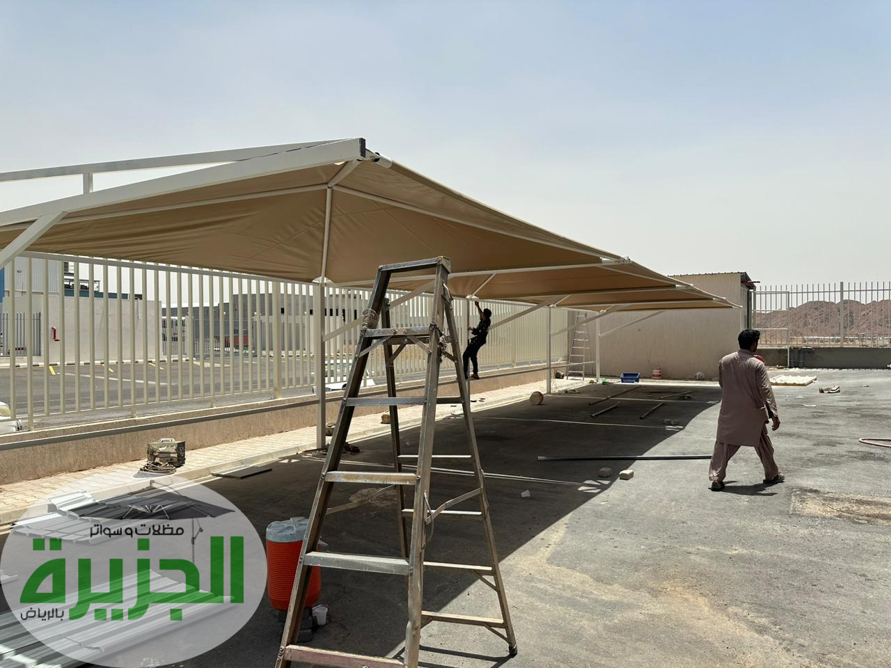 ​نصيحة الخبراء: في أحياء شمال الرياض، نوصي دائماً بمظلات الـ PVC الألماني أو الكوري بوزن 1100 جرام، لأنها الأكثر صموداً أمام التقلبات الجوية القاسية.